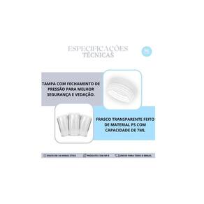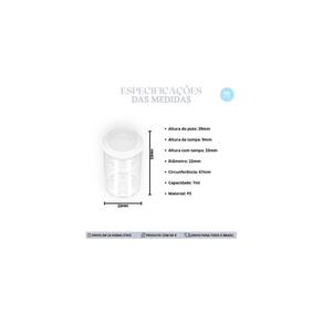 Especificações: Altura do pote 29mm Altura da tampa 9mm Altura com tampa 33mm Diâmetro 22mm Circunferência 67mm Capacidade: 7ml Material: PS