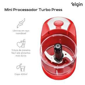 Compacto e fácil de armazenar, o Mini Processador Turbo Press Elgin é uma adição conveniente para qualquer cozinha, tornando as tarefas culinárias mais simples e eficientes.