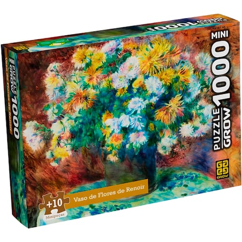 Descrição do produto : Este mini quebra-cabeça de 1000 peças apresenta a obra "Vaso de Flores de Renoir", um deslumbrante quadro de Pierre-Auguste Renoir. A ilustração captura a essência vibrante e colorida das flores, características que definem o estilo impressionista e inconfundível de Renoir. : Detalhes técnicos : Marca: Grow : Referência: 04609 : Idade recomendada: 10 : Possui Luzes: Não : Possui Sons: Não : Dimensões aproximadas da embalagem: 24,6 x 18,0 x 4 cm (A x L x C) : Ean: 7908010146097 : Tamanho da Imagem : 44 x 30 cm : Componentes : 1 quebra-cabeça com 1000 peças :