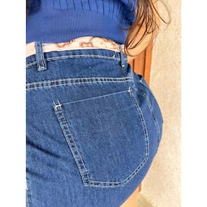 A saia na imagem é uma minissaia jeans com lavagem escura e cintura alta. Ela tem um corte reto e justo ao corpo, com bolsos na parte da frente que adicionam um detalhe funcional e um cinto de tecido colorido amarrado na cintura, que não é parte da saia, mas complementa o visual. A barra da saia é simples e sem detalhes, como desfiados. Marca: Não Informado