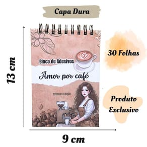 - 27 folhas - Capa Dura - Espiral Wire-o - Artesanal - Papel adesivo fotografico 135 gramas - Adesivos internos no tamanho aproximado entre 2,5 a 7,5 cm - Todos os adesivos sao com a tematica de cafe