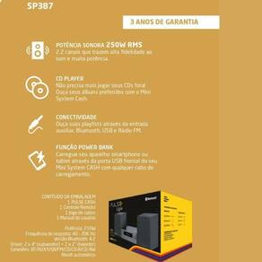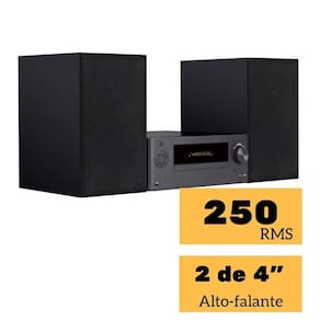 Especificações técnicas: - Potência: 250w RMS - Falantes: 2 x 4 polegadas Subwoofer - Tweeter: 2 x 2 polegadas - Canais: 2.2 - Entrada para CD player: CD / CD-R / CD-RW - Entrada USB: Sim - Bluetooth: Sim 4.2 - Controle Remoto: Sim - Entrada Auxiliar: Sim - Rádio FM: Sim - Jogo de Cabos: Sim - Frequência: 40 – 20K Hz - Bivolt Automático