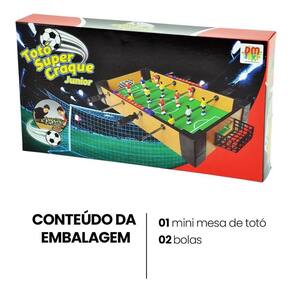 Especificações Técnicas: Material: Madeira Dimensões: 40cm comprimento x 22cm largura x 7cm altura Itens inclusos: 1 Mini Mesa de Totó, 1 Manual de instruções, 2 Bolinhas de Totó.