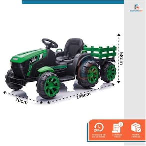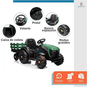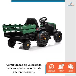 O Trator com reboque extra grande é o presente ideal para trazer diversão para o seu filho. Adequado para pastagem, estrada de asfalto, calçada e entrada de tijolos, com 2 velocidades, equipado com mp3 player, rádio, porta usb, cinto de segurança ajustável para uso seguro e confortável. Conta ainda com bateria recarregável para permitir horas de reprodução. CARACTERÍSTICAS TÉCNICAS:Material: PP e ferroMedidas: 63,5cm (altura) x 66,04cm (largura) x 154,9cm (comprimento)Idade recomendada: de 3 a 8 anosPeso suportado: Até 28kgVelocidade: 5 a 7km/hTempo de carregamento: 8 a 12hTempo de duração: 1 a 2hTipo de batería: 24V 7ahMotor: 200W * 2Marca: Baby StyleRef.: 998537 O pacote inclui:1 x trator1 x carregador1 x manual