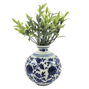 Estampa Floral Clássica: Padrão azul sobre fundo branco, com acabamento refinado. Porcelana de Alta Qualidade: Brilho, resistência e delicadeza em uma só peça. Pequeno e Versátil: Ideal para espaços reduzidos e composições delicadas. Boca Estreita: Perfeita para hastes finas ou uso decorativo sem flores.