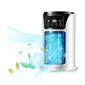Características: Desfrute de 3 Funções em 1: Este ventilador de ar condicionado de mesa combina três funções essenciais em um só produto: sopro, resfriamento e umidificação. Mais do que um ventilador comum, ele eleva o conforto do ambiente ao proporcionar ar fresco e úmido. Além disso, pode filtrar poeira, melhorando a qualidade do ar.