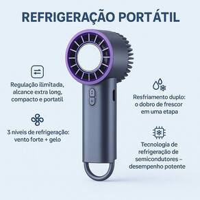 .Regulação ilimitada de intensidade com alcance extra longo. .Três níveis de refrigeração: vento forte + efeito gelo para máxima performance. .Resfriamento duplo: o dobro de frescor em apenas uma etapa. .Tecnologia de semicondutores que garante refrigeração potente e rápida. .Compacto e portátil, ideal para levar na bolsa ou usar em viagens. .Seguro e moderno. .Bateria recarregável de longa duração com entrada usb dc 5v .