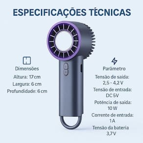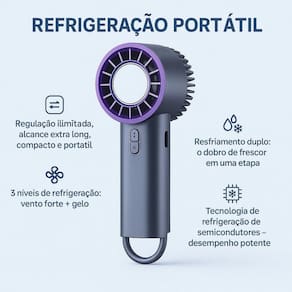 .Regulação ilimitada de intensidade com alcance extra longo. .Três níveis de refrigeração: vento forte + efeito gelo para máxima performance. .Resfriamento duplo: o dobro de frescor em apenas uma etapa. .Tecnologia de semicondutores que garante refrigeração potente e rápida. .Compacto e portátil, ideal para levar na bolsa ou usar em viagens. .Seguro e moderno. .Bateria recarregável de longa duração com entrada usb dc 5v .
