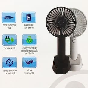 Mini Ventilador Multiuso Portátil Recarregável Usb Preto É muito prático e versátil de usar para se refrescar seu ambiente de trabalho,estudo ou até mesmo secar a sua maquiagem. Pode ser Utilizado na mesa ou prateleira tendo um longo tempo de uso. Carregamento USB Bateria de Lítio 18650 Recarregável Conservação de energia e proteção ambiental Longa duração de vida útil Ótima ventilação Caracteristicas - Medida: 106mm x 210mm x 40mm - Entrada Carga: Dc5v - 1.0a - Versão Bateria: 18650 - 3,7v - Cor: Preto