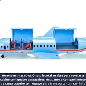 Aeronave Interativa: O teto frontal se abre para revelar a cabine com quatro passageiros, enquanto o compartimento de carga traseiro tem espaço para transportar um carrinho (não incluso). Realismo em Ação: Possui trem de pouso retrátil para simular decolagens e pousos perfeitos e luzes de LED que se apagam automaticamente para poupar energia. Veículo "Follow-Me": Um veículo de apoio com luzes piscantes para guiar a aeronave com segurança pelo pátio do aeroporto. Trator de Reboque: Inclui um potente trator com barra de reboque para manobrar o avião até o portão de embarque. Controle em Solo: Uma figura de sinalizador de pátio (marshaller) está inclusa para coordenar todas as operações em terra. Dimensões Imponentes: Medindo 36,3 cm de comprimento por 38,5 cm de largura, é uma peça central em qualquer coleção.