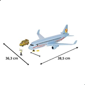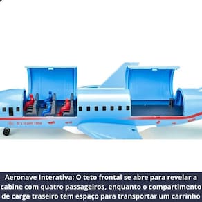 Aeronave Interativa: O teto frontal se abre para revelar a cabine com quatro passageiros, enquanto o compartimento de carga traseiro tem espaço para transportar um carrinho não incluso . Realismo em Ação: Possui trem de pouso retrátil para simular decolagens e pousos perfeitos e luzes de LED que se apagam automaticamente para poupar energia. Veículo Follow-Me: Um veículo de apoio com luzes piscantes para guiar a aeronave com segurança pelo pátio do aeroporto. Trator de Reboque: Inclui um potente trator com barra de reboque para manobrar o avião até o portão de embarque. Controle em Solo: Uma figura de sinalizador de pátio marshaller está inclusa para coordenar todas as operações em terra. Dimensões Imponentes: Medindo 36,3 cm de comprimento por 38,5 cm de largura, é uma peça central em qualquer coleção.