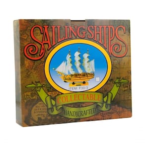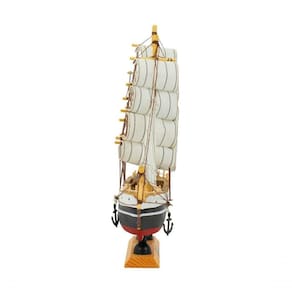 Enfeite no formato de miniatura de barco navio veleiro com 25,5 cm de altura, 5 cm de largura e 30 cm de comnto. Modelo se destaca com a base do casco do navio na cor vermelha. Vem com suporte para ficar em posição. Material: madeira; Função exclusivamente decorativa