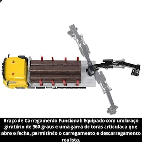 Braço de Carregamento Funcional: Equipado com um braço giratório de 360 graus e uma garra de toras articulada que abre e fecha, permitindo o carregamento e descarregamento realista.
