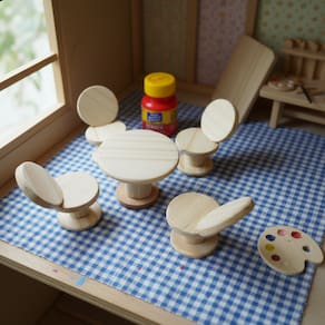 Miniatura de Mesa Redonda com 4 Cadeiras – Madeira Natural Conjunto artesanal composto por mesa redonda e quatro cadeiras, produzido em madeira crua com acabamento fino em lixa 320. Ideal para miniaturas, dioramas, casas de bonecas, artesanato e decoração de pequenos ambientes. Dimensões das peças: