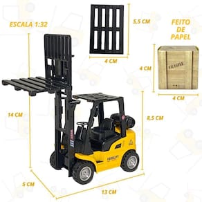 O que você vai receber em sua casa -1 empilhadeira em miniatura -1 pallet miniatura -1 caixa medidas: altura: 8,5 cm largura: 5 cm comprimento: 13 cm material: metal idade recomendada: acima de 3 anos