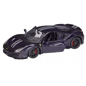 A miniatura da Ferrari 488 Pista é uma réplica detalhada e precisa do carro esportivo de alta performance em escala reduzida. Na cor vermelha, a miniatura apresenta um acabamento brilhante que reflete a luz de forma realista. Os detalhes da pintura são retratados com precisão, incluindo as faixas esportivas e as logomarcas da Ferrari.