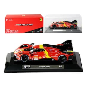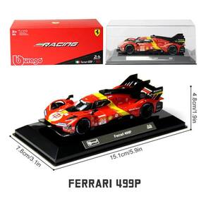 marca: bburago modelo: ferrari 499p le mans #51 escala: 1:24 tamanho: 15x7,8x 4,8cm material: corpo metálico, pneus de borracha função: pode abrir a porta