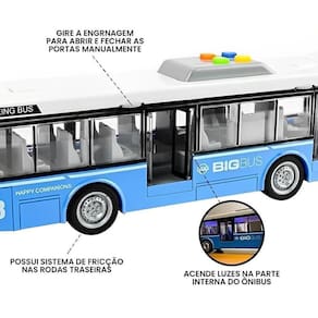 Miniatura Ônibus Brinquedo Com Som Luz E Fricção R3234 BBR O ônibus da Mega City foi feito para crianças que gostam de se divertir muito com carrinhos de brinquedo, estimulando a sua criatividade, imaginação e coordenação motora durante suas brincadeiras. O Ônibus Possui um design clássico, com detalhes incríveis e mecanismo de fricção nas rodas traseiras, ou seja, é só puxar o carrinho para trás em uma superfície que ele vai correr sozinho. Emite luzes na parte interna, sons de ônibus de verdade, como: sirene, buzina, partida do motor e ré, além de poder, abrir as portas manualmente girando a engrenagem. Alimentação: Utilizar 03 baterias do tipo AG13 1,5V.