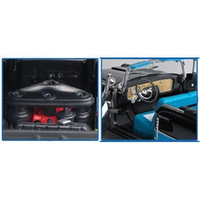 Rodas: Réplicas fiéis das rodas autênticos, com aros cromados e pneus de borracha macia com frisos brancos.