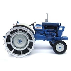 A jumelage com gaiolas de metal na parte traseira do trator Ford 5000 permite melhor aderência em terrenos difíceis. Este trator miniatura à l'échelle 1/32 foi fabricado em série limitada a 1500 exemplares.