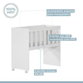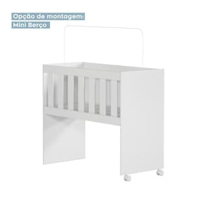 Miniberço Multifuncional Rubi : Escala de Brilho ; Acetinado : Cor do Produto ; Branco : Cor Predominante ; Branco : NCM ; 94035000 : Origem ; 0 - Nacional : Tipo da embalagem ; Caixa (s) : Unidade ; Unidade : Unidade Fracionada ; 1 : Garantia ; 03 meses : Ambiente Principal ; Quarto de Bebê : Tipo de Berço ; Mini Berço : Certificação Inmetro (Código) ; BER-619/2017-6 : Altura ; 80cm" : Largura ; 94cm" : Profundidade ; 43cm" : Peso ; 17,8 : Rodízio com Trava ; Sim : Acabamento ; Pintura UV : Material Principal ; MDF : Acompanha Colchão ; Sim : Tamanho do Colchão Indicado (L x C) ; 90 x38 x70 : Densidade da Espuma ; D-18 : Tamanho do Colchão (L x C) ; 90 x38 x70 : Tipo de Estrado ; Removível : Material do Estrado ; MDF : Altura do Estrado até o Chão ; 48,5 : Estrado com Regulagem de Altura ; Não : Permite a Utilização de Cama Auxiliar ; Não : Acompanha Cama Auxiliar ; Não : Possui Portas ; Não : Possui Prateleiras ; Não : Altura dos Pés ; cm" : Material dos Pés ; : Acabamento dos Pés ; Possui Rodízio ; Sim : Possui Gavetas ; Não : Estrado Regulável em Quantas Posições ; : Quantidade de Rodízios com Trava ; 02 : Possui Pés ; Não : Pintura Atóxica ; Sim : Sistema Anti-Refluxo ; Não : Multifunção Flex ; Não : Estilo ; Contemporâneo : Necessita Montagem ; Sim : Complexidade da Montagem ; Média: pode ser montado por mais de uma pessoa e/ou necessite de maior conhecimento para montagem : Recomendações de Uso, Manutenção e Limpeza ; Limpeza com pano macio e levemente umedecido. Não utilizar solventes a base de inflamáveis. Não utilizar produtos abrasivos. : Sistema de Montagem ; Parafusos auto-atarrachantes e buchas americanas. : Itens Inclusos ; 1 Berço e manual de montagem. : Informações adicionais ou características excepcionais do produto. ; Miniberço para uso, principalmente durante o resguardo, para bebês qua ainda não sentam, ajoelha e levantam sozinhas, pode ser levado de um ambiente ao outro sem a necessidade de desmontar. Além de sua utilização como berço o produto pode ser reutilizado de acordo com o crescimento da criança. Fabricado em 100% MDF com sistema de fixação por parafusus e porcas, acompanha kit rodízios. Acabamento acetinado. Acompanha Colchão. : Se a grade lateral do berço é fixa ou móvel ; Fixa : Material da grade lateral ; MDF : Se o produto acompanha Suporte para Mosquiteiro no Berço ou não ; Sim - Sem Véu :