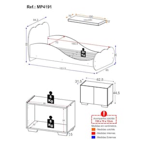 Dimensões do produto montado: Minicama - Altura: 69cm | Largura: 153,5cm | Profundidade: 85cm Colchão - Altura: 12cm | Largura: 150cm | Profundidade: 70cm Mesa de Cabeceira - Altura: 44,5cm | Largura: 62,5cm | Profundidade: 31,5cm *Você pode consultar as medidas detalhadas na imagem técnica do produto.