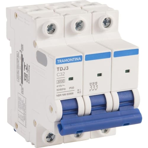 Com o Minidisjuntor TDJ3 3 P 32 A 3kA curva C Tramontina você irá garantir alta qualidade para seus projetos elétricos. Desenvolvido para garantir a segurança da instalação, ele preserva a rede elétrica e seus equipamentos em caso de sobrecarga ou curto-circuito. Ele possui janela de inspeção do estado, é instalado no quadro de distribuição e dimensionado de acordo com a potência dos equipamentos, números de tomadas e quantidade de lâmpadas. Sua montagem é individual, sem a necessidade de desmontar o barramento, o que otimiza o tempo de instalação. Um item com a qualidade Tramontina, que você já conhece e confia