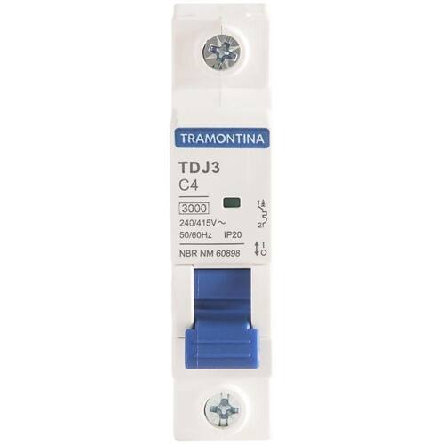 Minidisjuntor Tdj3ka 1 P 4 A Curva C Tramontina Minidisjuntor TDJ3kA 1 P 4 A curva C Tramontina Leve alta qualidade para seus projetos elétricos, com o minidisjuntor TDJ3kA 1 P 4 A curva C Tramontina. Desenvolvido para garantir a segurança da instalação ele preserva a rede elétrica e seus equipamentos em caso de sobrecarga ou curto-circuito. Ele possui janela de inspeção do estado, é instalado no quadro de distribuição e dimensionado de acordo com a potência dos equipamentos, números de tomadas e quantidade de lâmpadas. Sua montagem é individual, sem a necessidade de desmontar o barramento, o que otimiza o tempo de instalação. Um item com a qualidade Tramontina, que você já conhece e confia!