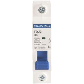 Minidisjuntor Tdj3ka 1 P 6 A Curva C Tramontina Minidisjuntor TDJ3kA 1 P 6 A curva C Tramontina Leve alta qualidade para seus projetos elétricos, com o minidisjuntor TDJ3kA 1 P 6 A curva C Tramontina. Desenvolvido para garantir a segurança da instalação ele preserva a rede elétrica e seus equipamentos em caso de sobrecarga ou curto-circuito. Ele possui janela de inspeção do estado, é instalado no quadro de distribuição e dimensionado de acordo com a potência dos equipamentos, números de tomadas e quantidade de lâmpadas. Sua montagem é individual, sem a necessidade de desmontar o barramento, o que otimiza o tempo de instalação. Um item com a qualidade Tramontina, que você já conhece e confia!
