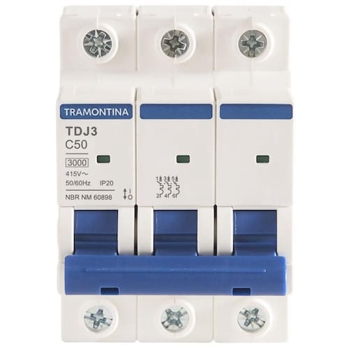 Minidisjuntor Tdj3ka 3 P 50 A Curva C Tramontina Minidisjuntor TDJ3kA 3 P 50 A curva C Tramontina Com o Minidisjuntor TDJ3kA 3 P 50 A curva C Tramontina você irá garantir alta qualidade para seus projetos elétricos. Desenvolvido para garantir a segurança da instalação, ele preserva a rede elétrica e seus equipamentos em caso de sobrecarga ou curto-circuito. Ele possui janela de inspeção do estado, é instalado no quadro de distribuição e dimensionado de acordo com a potência dos equipamentos, números de tomadas e quantidade de lâmpadas. Sua montagem é individual, sem a necessidade de desmontar o barramento, o que otimiza o tempo de instalação. Um item com a qualidade Tramontina, que você já conhece e confia!