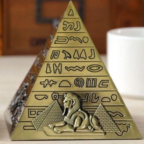 Enfeite Pirâmide Estátua Egito Decoração Escultura Metal Pirâmide Egípcia Enfeite Decoração Este item apresenta quatro faces, cada uma com um padrão distinto. Cria uma atmosfera misteriosa e de época. Produzido em metal com tonalidade Ouro Velho.