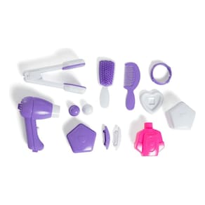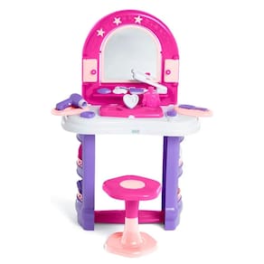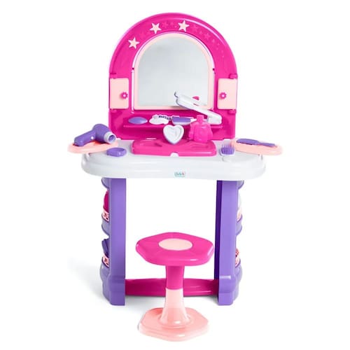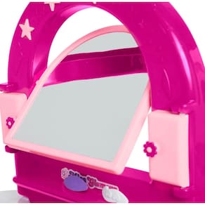 Isso mesmo, com espelho, banquinho e diversos acessórios para brincar com a turma. Além do espelho que é retrátil (3 posições), a penteadeira vem com porta jóias, mini porta retrato e frascos de perfume para que a produção seja completa.