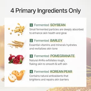 - O ingrediente principal deste produto são os grãos fermentados, que oferecem habilidades superiores de hidratação, absorção e aderência em comparação aos grãos comuns. Eles efetivamente reabastecem a umidade profunda da pele, promovendo firmeza e resiliência, resultando em uma pele mais saudável e flexível.
