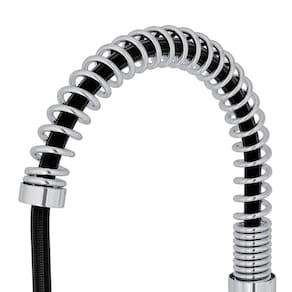 Ele tem um flexível argolado que parece coisa de cozinha profissional, mas também traz um toque de carinho e praticidade para o dia a dia. E a ducha de longo alcance ajuda muito. Você pode escolher entre: