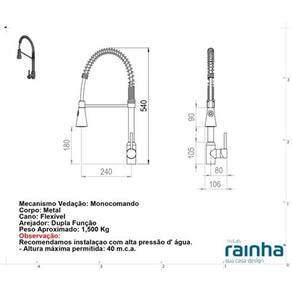 A torneira Gourmet dispõem de 2 bicas, monocomando que facilita seu uso dando mais resistência e uma precisa regulagem da vazão da temperatura da água, feita em apenas um comando.Fabricado em Metal, sua durabilidade é bem maior do que as torneiras convencionais.Com um design inovador e moderno, a torneira gourmet monocomando proporciona um ambiente mais sofisticado.Características- Ajuste Gradual de Temperatura (monocomando)- Cor: aço cromado- Temperatura máxima da água: 70°C- Cartucho Cerâmico de alta performance (500.000 ciclos)- Pressão Mínima de água recomendada: 3 mca- Pressão Máxima de água Recomendada: (x) mca- O produto não possuiaquecimento interno.- Este produto mesmo sendo monocomando (feito para água quente e fria), também pode ser utilizado somente com água fria. Nesse caso é necessário a utilização de um “T” no encanamento para ser possível a ligação dos dois flexíveis. Acessório “T” não incluso. OBS: (M.C.A.Significa Metros de Coluna d’Água, indica qual a pressão que a água exerce sobre determinada altura. ou seja, 1 m.c.a = 1 metro de altura.) Marca: Não Informado