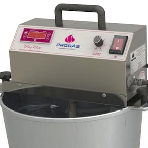Conta com caçarola em alumínio fundido para melhor distribuição do calor, com diâmetro de 205mm e profundidade de 120mm e cabeçote em chapa de aço inox. Seus raspadores são em silicone, contando também com temporizador digital, controle eletrônico de velocidade e beep de aviso de tempo programado.