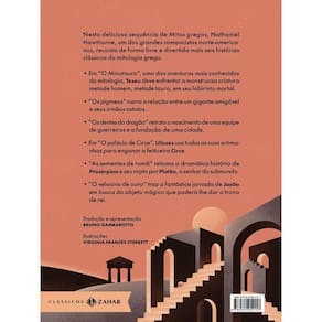 Novas histórias da mitologia grega especialmente adaptadas pelo autor de A letra escarlate. Nesta deliciosa sequência de Mitos gregos, Nathaniel Hawthorne, um dos grandes romancistas norte-americanos, reconta de forma livre e divertida mais seis histórias clássicas da mitologia grega. - Em “O Minotauro”, uma das aventuras mais conhecidas da mitologia, Teseu deve enfrentar a monstruosa criatura metade homem, metade touro, em seu labirinto mortal. - “Os pigmeus” narra a relação entre um gigante amigável e seus irmãos astutos. - “Os dentes do dragão” retrata o nascimento de uma equipe de guerreiros e a fundação de uma cidade. - Em “O palácio de Circe”, Ulisses usa todas as suas artimanhas para enganar a feiticeira Circe. - “As sementes de romã” retoma a dramática história de Prosérpina e seu rapto por Plutão, o senhor do submundo. - “O velocino de ouro” traz a fantástica jornada de Jasão em busca do objeto mágico que poderá lhe dar o trono de rei.