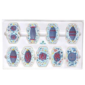 Modelo anatômico de mitose ilustra as 9 etapas da divisão celular de uma célula animal; Confeccionado em PVC; Está apresentada numa escala de aproximadamente 10.000: