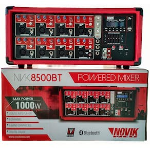Mixer amplificado 8 canais nvk-8500bt usb novikConsole de 8 canais com entrada para mic e line amplificado e leitor de mp3/ BluetoothIdeal para Utilização em locais que necessitam de mixadores de até 8 canaiscom qualidade sonora superior e praticidade de uso.Basta apenas a conexão de 1 ou 2 caixas de som com impedância nominal indicadano aparelho, conectar o aparelho na rede elétrica e microfones ou instrumentos musicaisnos canais de entrada e está pronto para utilização...A potência real de 250W Rms garante som claro e ótima qualidade.Principais Características:-Alça superior para transporte-Mixer 8 Canais Amplificado -Reprodutor mp3-conexão usb/sd com bluetooth-display lcd-Controle remoto para funções de mp3/usb/sd/bluetooth-Entradas de microfones balanceadas xlr-Entradas de linha 1/4 p10 e rca-Saída para um subwoofer ativo-entrada auxiliar/saída para gravação-Equalizador low/high (2 bandas) em cada canal-Controle de efeito por canal (delay)-Controle do nível de efeito, tempo e repetição-Equalidador de 5 bandas no canal master. -Potência total de 250W rms-Impedância mínima de saída 4 Ohms-Cooler para ventilação internaFunções nos Canais de entrada 1 a 8:-Mic In Xlr-Line In P10-Controle Graves-Controle Agudos-Controle fx-Controle de Ganho (volume do canal)Funções no canal master:-Função Delay com ajuste de nivel, tempo e repetição-Line In conector p10-Line Out Conector P10-Sub Out-Auxiliar In L/R conector RCA-Saída Rec L/R Conector RCA-Leitor mp3 via usb/sd/bluetooth-Comandos do leitor: mode, play/pause,stop, repeat, retrocesso, avanço-Equalizador Gráfico 5 Bandas 100hz, 500hz, 1khz,2.5khz, 10khz-Volume auxiliar-Volume master-Chave power on-Led power onFunções no painel traseiro:-Conector ac in-Chave seletora de voltagem 110/220v ac-Saídas amplificadas conector p10-Cooler para refrigeração. Medidas do produto:Comprimento: 47 cmAltura: 21 cmLargura: 23 cmPeso: 7500 grMedidas do produto embalado:Comprimento: 53 cmAltura: 27 cmLargura: 30 cmPeso: 9300 gr