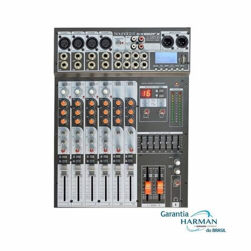 Canais totais de mixagem 8 Canais mono (XLR) 4 Entradas esTéreo 2 Entrada de sinal auxiliar esTéreo 1 Entrada de sinal esTéreo "play in" 1 Saidas de áudio auxiliares (REV/AUX) 2 Tipos de delay 16 A SX802FX USB é uma mesa analógica de última geração, que agora conta com reprodução de arquivos em MP3 via USB. Possui oito canais, sendo quatro para entrada mono XLR, dois canais com entradas esTéreo e dois auxiliares.