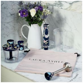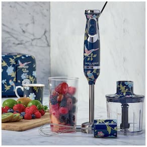 Mixer de imersão 4 em 1 com motor de 150W, duas velocidades ajustáveis. Inclui haste de mistura em inox, batedor de inox, recipiente picador e copo medidor de 300ml. Acessórios removíveis compatíveis com lava-louças. Design ergonômico com acabamento azul marinho estampado Elveden.Acompanha copo