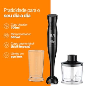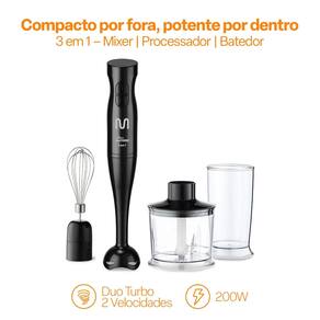 Mixer 3 em 1 (mixer, mini processador e batedor de claras), 200W de potência, 2 velocidades, lâmina em aço inox, corpo desmontável, design ergonômico.Acompanha copo