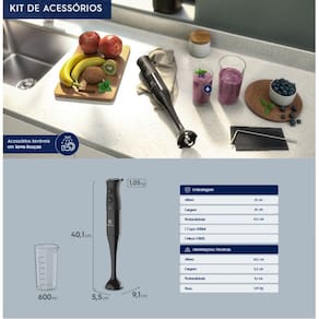 - **Modelo:** EIB05- **Potência:** 400W- **Voltagem:** 127V ou 220V- **Cor:** Preto- **Altura do produto:** 40,1 cm- **Largura do produto:** 5,5 cm- **Profundidade do produto:** 9,1 cm- **Peso:** 1,05 kg- **Cabo elétrico:** 1,2m- **Material da haste:** Plástico- **Material do corpo:** Plástico- **Livre de BPA:** Sim (copo medidor)- **Tipo de lâmina:** Aço Inoxidável- **Tecnologia TruFlow:** Sim- **Velocidades:** 2- **Função Turbo:** Sim- **Acessórios inclusos:** 1 Copo de 600ml- **Garantia:** 1 ano