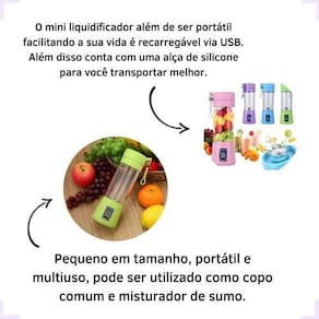 O mini liquidificador além de ser portátil facilitando a sua vida é recarregável via usb podendo ser carregado em notebook, powerbank e etc. Além disso conta com uma alça de silicone para você transportar melhor.