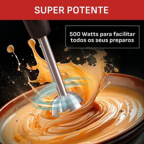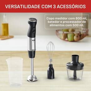 Arno Quick chef +, com tecnologia Powelix é a escolha perfeita para quem busca desempenho, praticidade e silêncio na cozinha. Com motor de 500w, ele garante até 3 vezes mais eficiência* no preparo de receitas, triturando até os ingredientes mais duros com facilidade. A tecnologia Powelix oferece alto poder de corte, com lâminas ultraafiadas que entregam resultados rápidos e homogêneos em qualquer tipo de preparo. Com painel digital com 20 velocidades, você tem o controle total, adaptando o uso conforme a textura desejada. O modo silencioso permite preparar suas receitas com conforto, ideal para uso diário sem incômodos. Acompanha 3 acessórios essenciais: copo medidor de 800ml, processador de alimentos de 500ml e batedor de claras, perfeitos para preparar desde smoothies, até chantillys e massas leves. Além de potente, o mixer feito em aço inoxidável é prático: pode ser utilizado diretamente na panela, seu pé é removível, facilitando a limpeza, e o design com protetor anti-respingos evita sujeiras indesejadas. Compacto, ergonômico e fácil de guardar, o Quick Chef+ é seu aliado para preparar molhos, sopas, sucos, purês e muito mais, com agilidade, eficiência e a qualidade que só a Arno oferece.