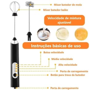 Mixer portátil com 2 cabeças batedoras (fouet e mola). Corpo em aço inoxidável. Motor de alta performance com 3 velocidades. Carregamento via USB. Bivolt.Acompanha copo