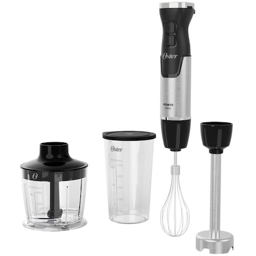 O Mixer Oster inclui três acessórios: fouet para misturar alimentos leves, mini processador de 500ml para temperos, e copo de 750ml com tampa para preparar e armazenar receitas.