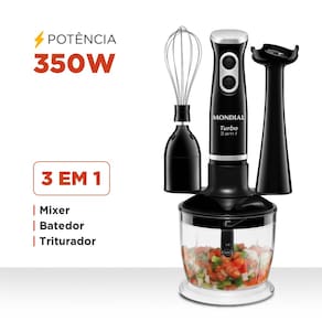 O Mixer Turbo M-14 é 3 em 1: mixer, batedor e triturador. Com ele, você pode preparar uma variedade de pratos: purês, molhos e caldos. Além de moer grãos, picar legumes e até bater massas leves. Incrível, não é? É muita praticidade em sua cozinha! O Mixer tem 350W e sua potência é suficiente para produção de receitas com textura homogênea e consistência perfeita. Saiba mais sobre o Mixer Turbo da Mondial: