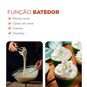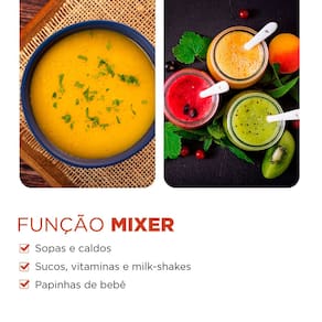 3 EM 1: IDEAL PARA A SUA COZINHA: São três funcionalidades: MIXER, BATEDOR e TRITURADOR. O batedor de claras em neve é ideal para bater massas leves, cremes e chantilly. Já o triturador funciona como processador de alimentos e é indicado para picar vegetais, legumes, ervas, temperos. Com a função mixer, você pode produzir sopas, papinhas de bebê, molhos, milk-shakes, sucos, vitaminas, e muito mais!