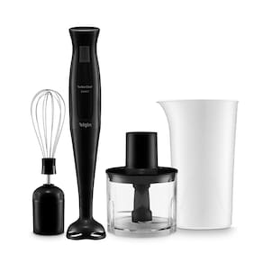 O aparelho é 3 em 1: mixer, triturador e batedor de ovos ou massas leves. Acompanha miniprocessador para triturar e picar alimentos com capacidade para 0,3 litros, copo para misturas com capacidade de 700 ml, lâminas em aço afiadas de alta performance, fouet flexível para bater ovos, claras ou massas leves.